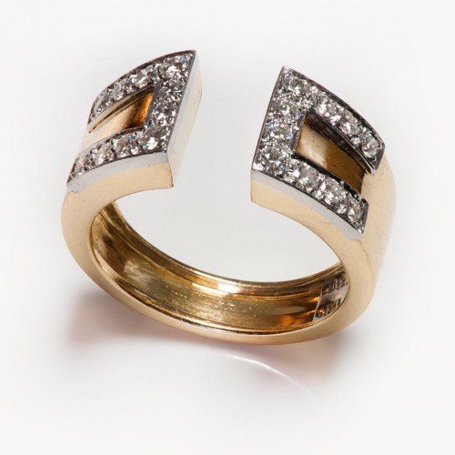 Each side of the ring is set with round brilliant-cut diamonds, creating a radiant contrast against the warm gold and cool platinum. The diamonds sparkle with exceptional clarity, enhancing the angular geometry of the piece.