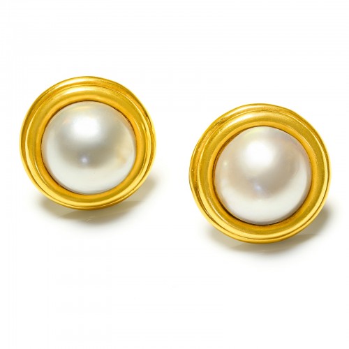 David Webb Signed Mabe Pearl Earrings in 18K Yellow Gold
