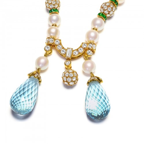 Vintage Diamond Emerald Pearl Necklace Aquamarine Briolettes