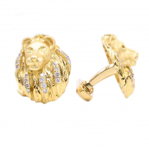 One of a kind, design as hand made lion head, crafted in 18k yellow gold, the face of the lion decorated with beautiful engaging mimicking hair with matte finish and the lions mane in a high polish finish accented with 48 round brilliant cut diamonds with diamonds.