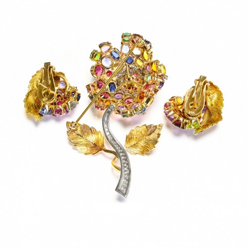 Diamond Multi Gemstone Gold Flower Earrings Brooch Set