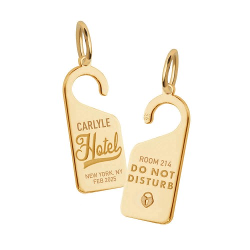 Consider this your sign to book a romantic getaway. Honeymooners, lovers, or those who simply love to travel will smile at the *wink wink* cheekiness of our gold vermeil hotel door hanger charm. The front side is engraved with “Hotel” in whimsical script while the back reads “DO NO DISTURB” in all caps. Flip the sign on your necklace or bracelet accordingly!
