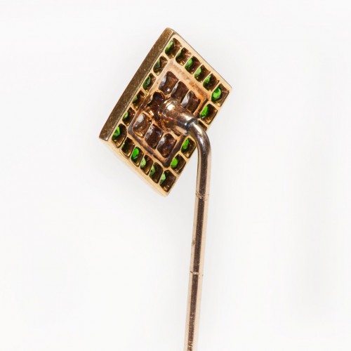 This Edwardian 14K yellow gold stick pin features a stunning arrangement of demantoid garnets and small old mine cut diamonds.