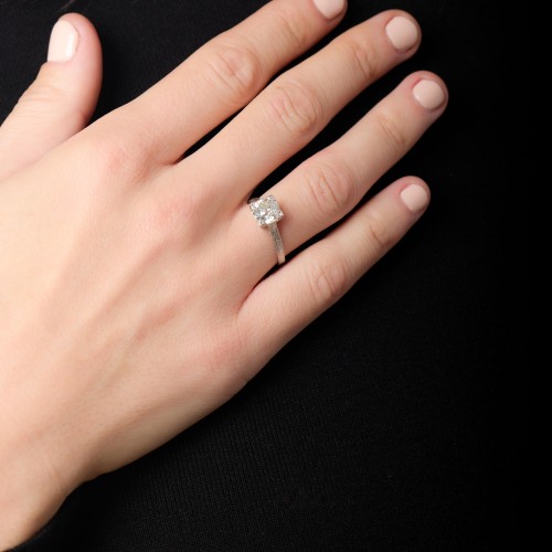 This exceptional Edwardian engagement ring embodies the quiet refinement and romantic artistry of the early 20th century. At its heart is a beautifully preserved 1.93 carat Old European cut diamond, celebrated for its soft, glowing brilliance and distinctive hand-cut facets. The M color imparts a gentle warmth that enhances the diamond’s antique character, while the high VS1 clarity allows light to move freely through the stone, creating depth, fire, and presence without distraction.