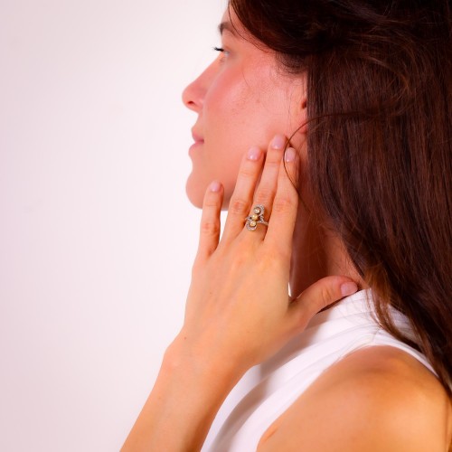This vintage 18k yellow gold ring from the 1910s showcases three luminous pearls, elegantly framed by sparkling rose cut diamonds for a timeless, refined look.