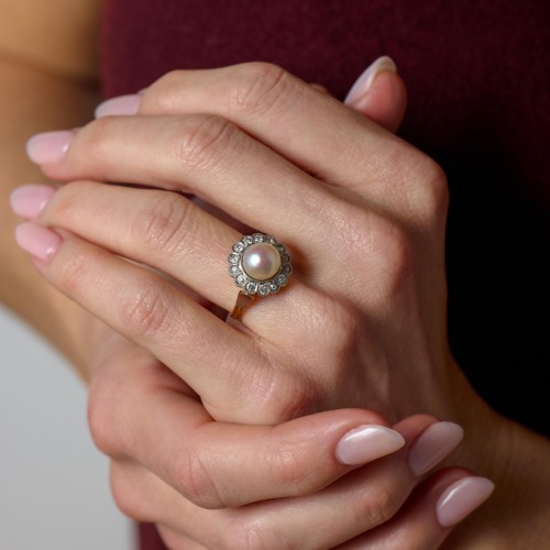Edwardian pearl diamond 18k yellow gold cluster ring