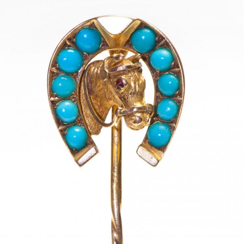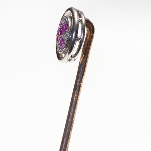 This Edwardian stick pin features vibrant rubies set in a luxurious blend of platinum and 18K gold.