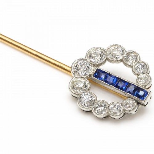 Designed with understated elegance, the circular arrangement of old-cut diamonds and precisely matched calibré-cut sapphires highlights the harmony of form and color, creating a balanced and visually refined composition. Stick pins of this quality were worn as subtle symbols of taste and refinement, favored for formal attire and ceremonial dress.