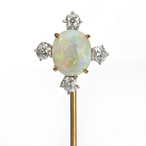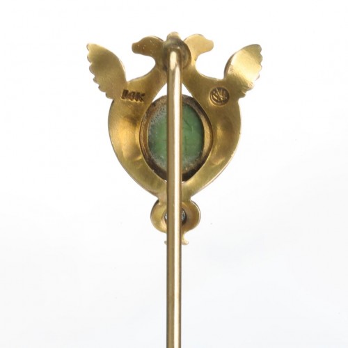 This Egyptian Revival stick pin features a beautifully carved turquoise scarab set in yellow gold, accented by a sparkling diamond.