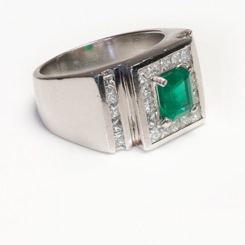 Vintage emerald diamond platinum men’s ring is the perfect choice for any man who wants to stand out. Crafted with lustrous platinum and set with square cut diamonds and emerald, this ring is a timeless display of sophistication and style.