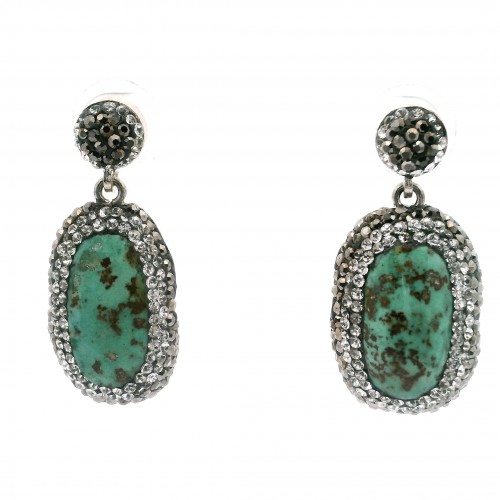 Emerald Stud Earrings – Faceted Oval with Marcasite & Silver Swarovski Crystals in 925 Sterling Silver