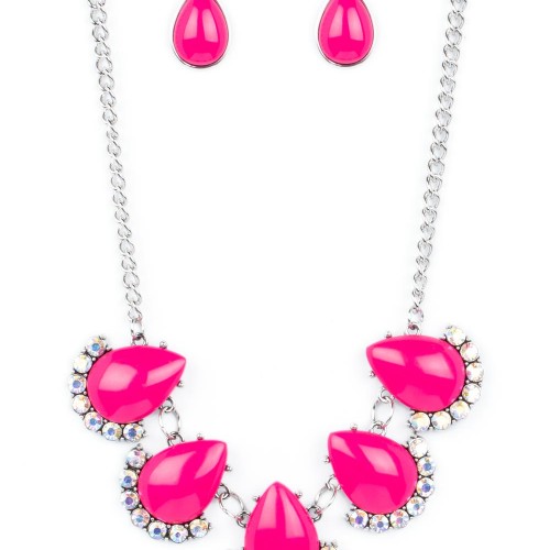 Underscored by rows of iridescent rhinestones, a row of oversized pink teardrop beads dramatically links into a powerful pop of color below the collar. Features an adjustable clasp closure. Due to its prismatic palette, color may vary.