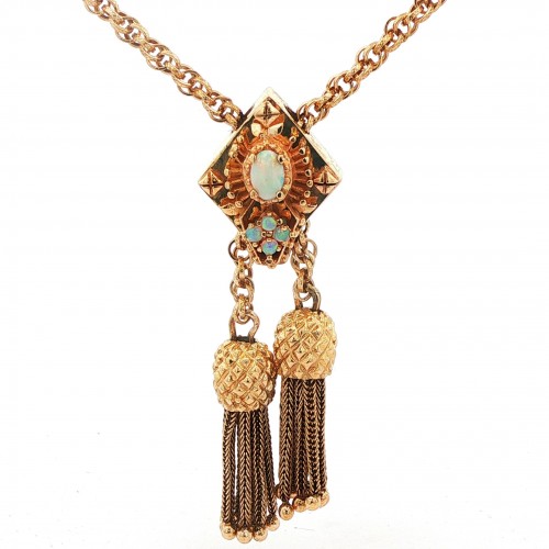 A sequence of Ethiopian opals in distinct silhouettes — half-moon, oval, pear, and square — gives this necklace its quiet rhythm. Each bezel-set stone is anchored on a linear gold chain, highlighting the natural variation of tone and shape.
