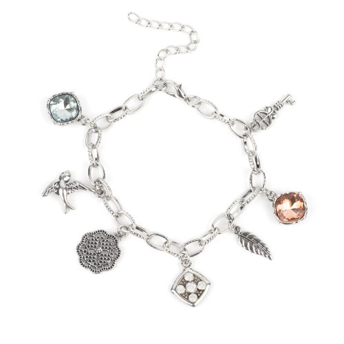 Multicolored gems, a floral medallion, a bird in flight, and a fluttering feather coalesce into a whimsical charm bracelet as they dangle from a delicate silver chain around the wrist. Features an adjustable clasp closure.