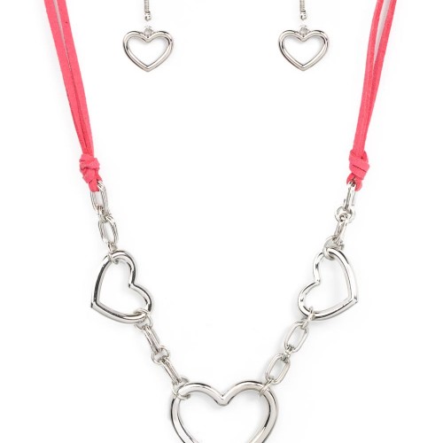 Strands of pink suede knot around sections of chunky silver chains that have been adorned in oversized silver heart frames, resulting in a flirtatious display below the collar. Features an adjustable clasp closure.