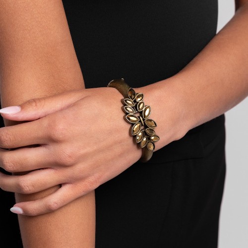 Flat turquoise stones pressed into brass frames provide a statement focal point around the wrist. Features an adjustable clasp closure. As the stone elements in this piece are natural, some color variation is normal.