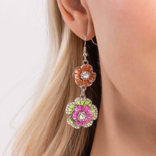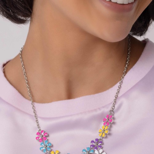 Painted in vivacious shades of hot pink, turquoise, yellow, purple, and white, a collection of silver studded flowers glide across the chest from a dainty silver chain for a whimsical array. Features an adjustable clasp closure.