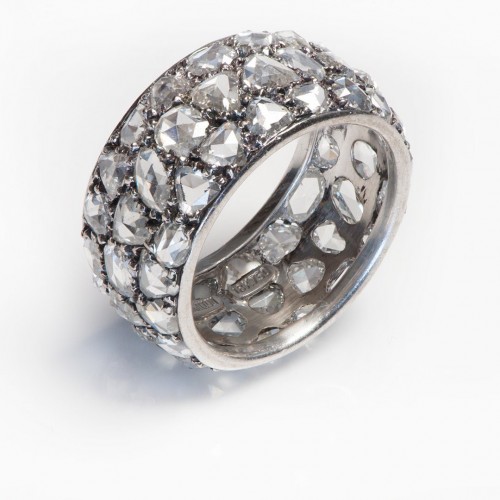 Mixed shape rose cut diamonds set in a three-row eternity band mounted in 18K white gold. Total diamond weight 5.27. Band Size 6.75 – 7.