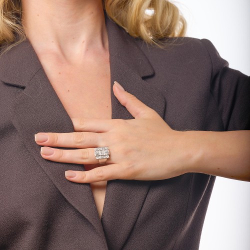 This bold French Mid Century ring is a striking expression of 1960s luxury, defined by confident scale, rich diamond presence, and substantial white gold craftsmanship. Designed with a powerful, chunky silhouette, the ring immediately commands attention while maintaining refined elegance through its carefully balanced proportions.