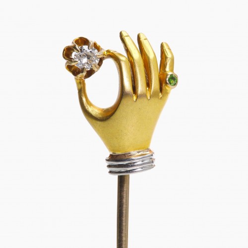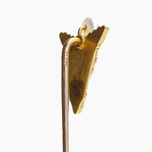 This Egyptian Revival stick pin features a regal pharaoh design in gold, highlighted by a lustrous natural pearl.