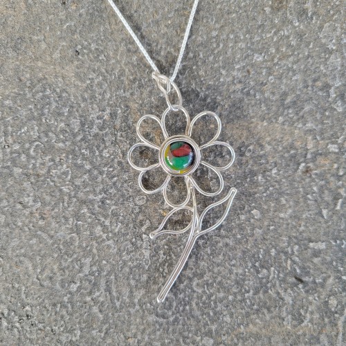 This unique and handcrafted pendant showcases bezel-set fused glass, that was hand painted with a tree design in sterling silver.