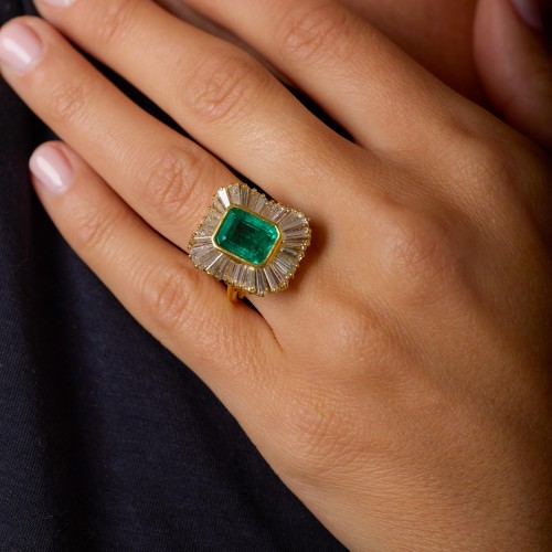 Encircling the emerald is a breathtaking halo of thirty-two tapered baguette diamonds, totaling approximately 2.50 carats. Arranged in the iconic ballerina style, these diamonds radiate outward like the swirling tulle of a dancer’s skirt, creating a dramatic burst of light with each movement. Their bright H color and refined VS clarity ensure that every facet contributes crisp brilliance, forming an exquisite frame that enhances the emerald’s vivid presence.