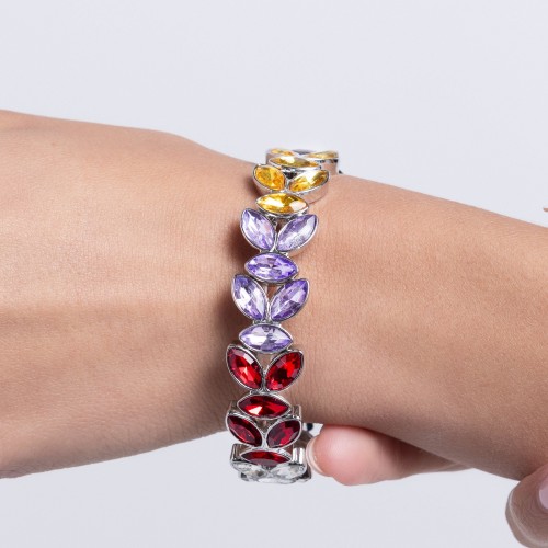Trios of elegant marquise multicolored rhinestones delicately join into leafy silver frames along a stretchy band, creating a refined display around the wrist.