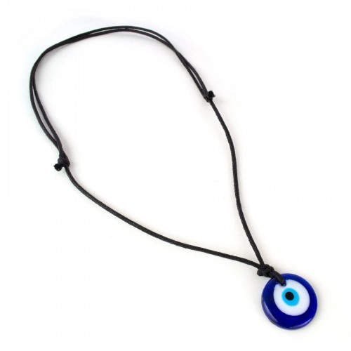 Now you can protect yourself from the evil eye, get some good luck and look great doing it. The idea expressed by the evil eye causes many cultures to pursue protective measures against it. Disks consisting of concentric blue and white circles representing an evil eye is common protective symbol. In some forms of the folklore, the staring eyes are supposed to bend the malicious gaze back to the sorcerer. Our evil eye pendant is hand made of glass and hangs from an adjustable black cord.