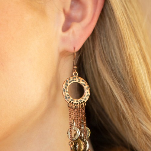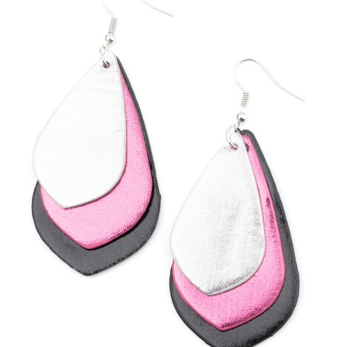 Featuring a metallic shimmer, silver, pink, and black leather teardrop frames layer into a shimmery stacked lure. Earring attaches to a standard fishhook fitting.