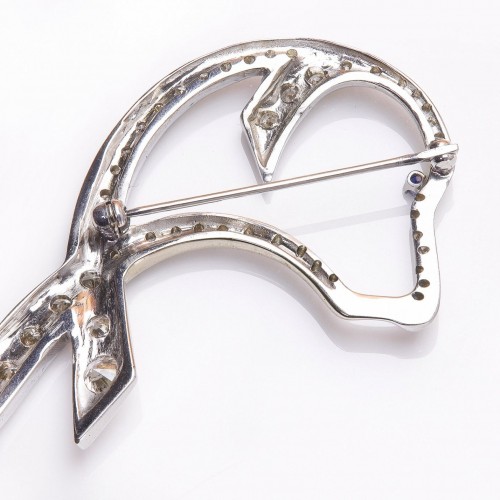 A charming and elegant brooch featuring a dog motif crafted in 18K white gold and adorned with round brilliant cut diamonds. The dog’s eye are set with a blue sapphire. This whimsical piece reflects the playful yet sophisticated style of the early 20th century, making it a delightful addition to any jewelry collection.
