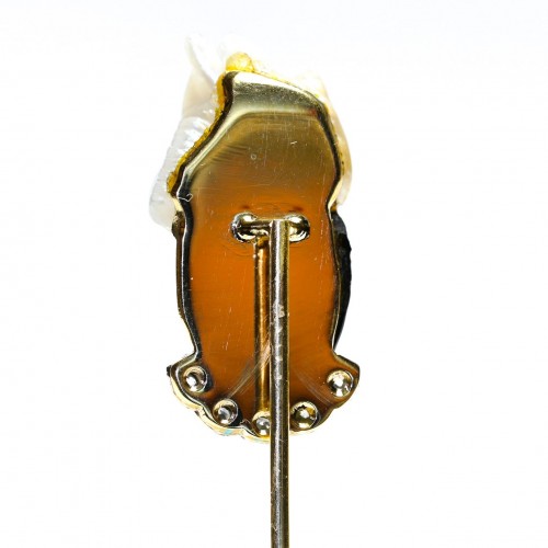 Gold Stick Pin with Freshwater Pearl, Diamond, and Carved Onyx Face