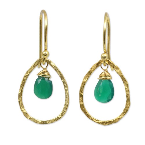 In green and gold, these earrings exude the elegant energy of artistic minimalism. Khun Boom selects onyx briolettes dyed a ravishing shade of green for her handcrafted design. The 24k gold plated brass earrings are worn on 24 gold plated sterling silver posts.