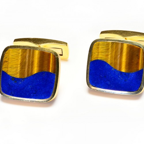 Luxury Gübelin 18K Yellow Gold Lapis and Tiger’s Eye Cufflinks