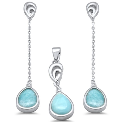 Marquise & Pear Shape Natural Larimar .925 Sterling Silver Earrings & Pendant Set