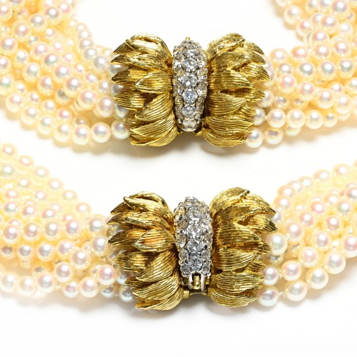 The Hammerman Brothers’ 18K Gold, Diamond, and Cultured Pearl set, comprising a necklace and bracelet, epitomizes luxury and fine craftsmanship. This exquisite ensemble highlights the brand’s dedication to elegance and quality. The necklace and bracelet both feature lustrous cultured pearls paired beautifully with dazzling diamonds, all set in rich 18K gold.