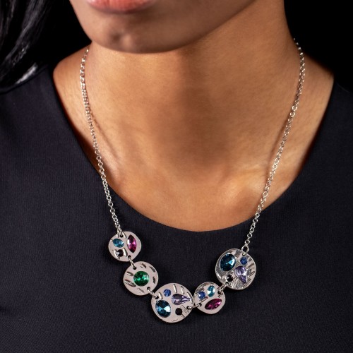 Falling down the neckline from a shimmery dainty silver chain, silver hammered discs embellished with shimmery pink, blue, purple, and green gems in round, teardrop, oval and marquise cuts, sparkle and shine for a dazzling finish. Features an adjustable clasp closure.