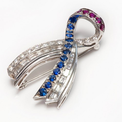 High quality gemstone brooch by Harry Winston, designed as a patriotic American ribbon, set in platinum, features full and baguette-cut diamonds weighing a total of approximately 1.50 carats, round-cut rubies, and round-cut sapphires. Signed HW for Harry Winston. Serial number 68833. Weight 10.5 grams. Approximate Measurements Length 1.48″ Width 0.95″
