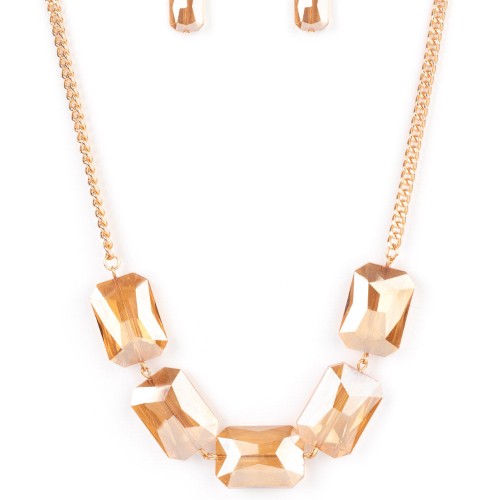Gorgeously oversized golden emerald cut gems fabulously link below the collar, creating an iridescently icy statement piece. Features an adjustable clasp closure.