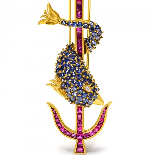 Helen Ringus Ruby Sapphire Diamond 18K Gold Dolphin and Anchor Pendant-Brooch