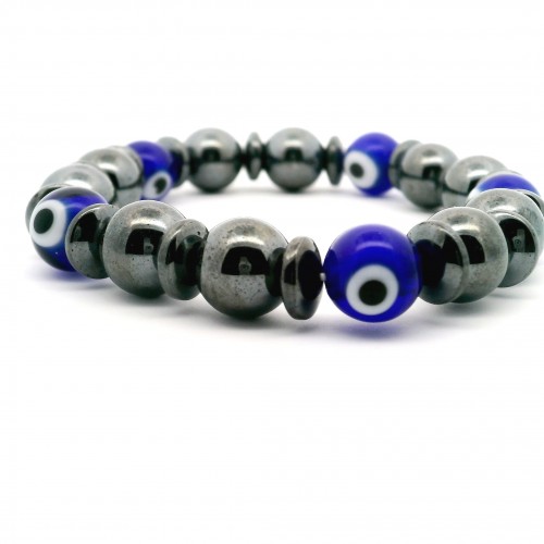 Hematite & Navy Evil Eye Beaded Bracelet 10mm Rounds with Hematite Rondells