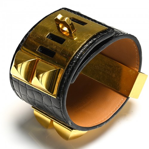 Hermes Paris Black Crocodile Gold Plated Collier de Chien Bracelet