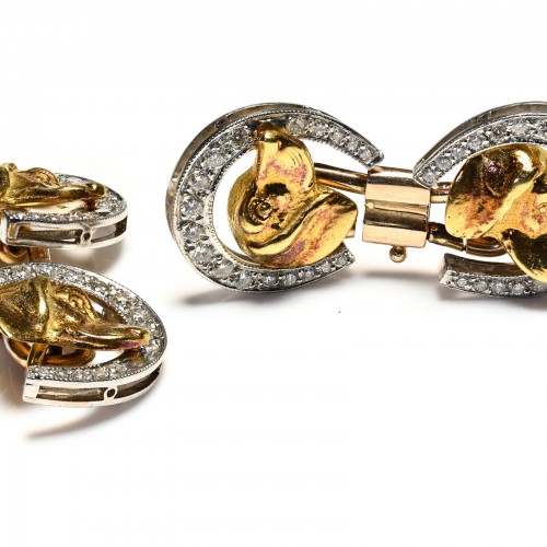 These cufflinks are a delightful fusion of tradition and personality. The horseshoe, a timeless symbol of good luck, paired with the charming dog, known for loyalty and companionship, makes these cufflinks not only a stylish accessory but also a conversation piece. The addition of diamonds enhances their luxurious appeal, making them suitable for any occasion, from business meetings to weddings.