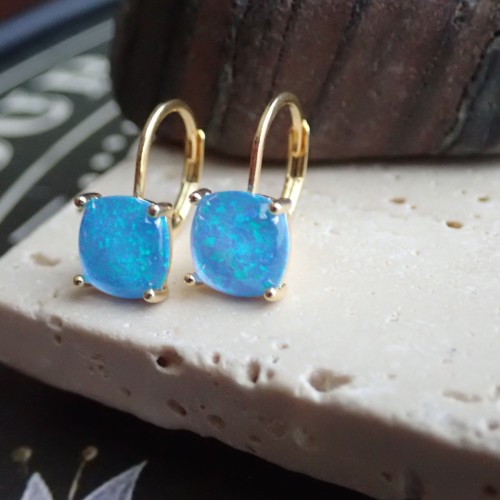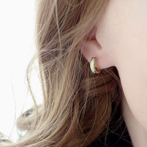 These comfortable, everyday little beauties will take you from day to night and look great dressed down but fit in to formal events with ease. Super fiery, ethically-sourced lab-created opals are inlaid into these darling little 14k gold plated hinge hoops. The opal inlay is on the front of the hoops only, the back is left 14k gold plated. Opal jewelry is so timeless and effortlessly chic.