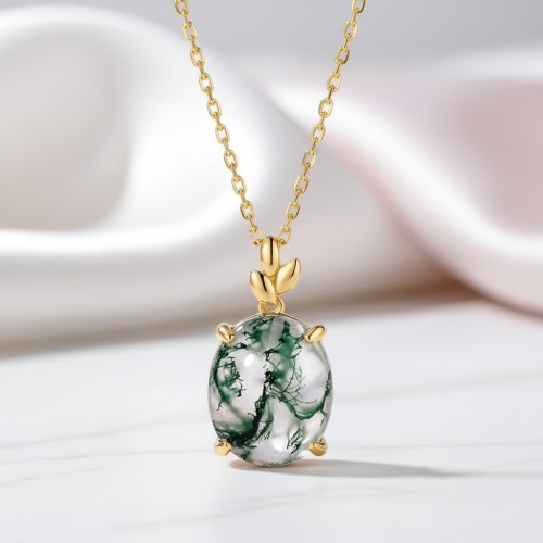 June Birthstone Natural Moss Agate Circle Leaves Necklace