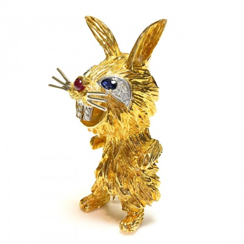 Bring a sense of joy and craftsmanship to your jewelry collection with this delightful bunny brooch by the legendary British jeweler Kutchinsky. Crafted in rich 18K yellow gold, the brooch showcases the brand’s signature attention to detail and whimsical charm. The bunny’s eyes are set with vivid blue sapphires, its nose with a glowing ruby cabochon, and its teeth sparkle with fine diamonds.
