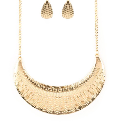 Stamped in an assortment of geometric patterns, an oversized gold half-moon pendant swings below the collar for a bold tribal style. Features an adjustable clasp closure.
