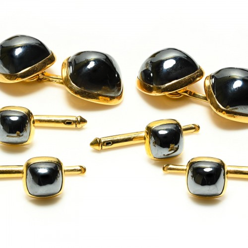 Exuding the refined sophistication of the Art Deco era, this exquisite set by Larter & Sons features gold cufflinks paired with four matching studs, each adorned with sleek, polished hematite gemstones. The striking contrast between the deep metallic luster of hematite and the warm radiance of gold creates a bold yet elegant aesthetic, perfect for the discerning gentleman.