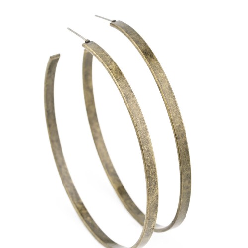 An antiqued brass hoop curls into an exaggerated curve for a rustic finish. Earring attaches to a standard post fitting. Hoop measures approximately 2 3/4″ in diameter.