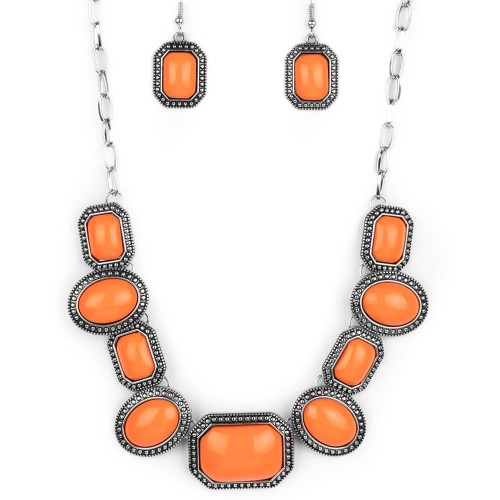 Bordered in silver studded oval and rectangular frames, a flamboyant collection of orange beaded frames delicately link below the collar for a colorfully rustic flair. Features an adjustable clasp closure.