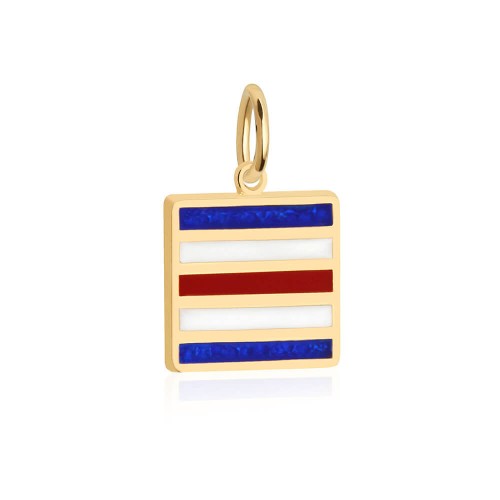 Nautical flags are like a secret language shared by sailors all around the world. And now you’re in on it. Bold enough to be seen on boats near and far, the mini sterling silver “G” (or, phonetically, “Golf”) nautical flag charm waves with alternating blue and yellow enamel vertical stripes and signals “I need a pilot!” on the high seas or simply your name, initials, or your own little code word when worn on a necklace or charm bracelet. Flip the charm to reveal the corresponding letter engraved on the back. Seafarers and land lovers alike will delight at the vibrant patterns and *wink wink* in-the-know fun of this eye-catching collection.